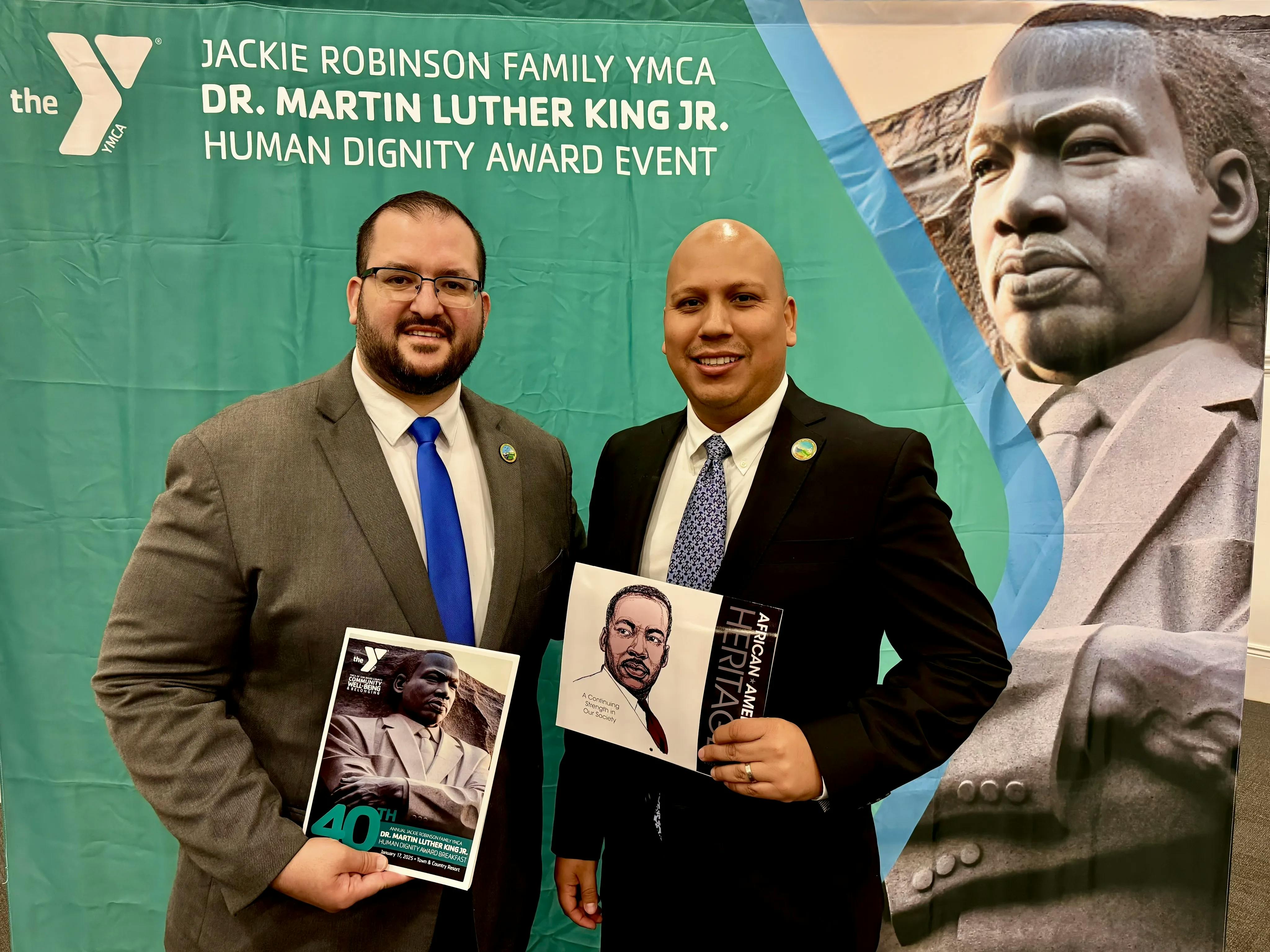 County Assessor Jordan Marks and Taxpayer Advocate Martín Arias celebrate at the Jackie Robinson Family YMCA Dr. Martin Luther King Jr. Human Dignity Award Event
